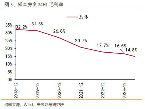 对于利润下滑,天风证券表示,上半年,房地产行业毛利率下行趋势持续,行业利润率拐点仍需时间。大型房企毛利率下滑较多,或主要因其为维持市场份额,采取“以价换量”方式,影响结转利润率,同时此前22年前地价较高或同样仍有拖累。