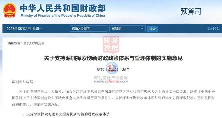 10月31日,国家财政部发布《关于支持深圳探索创新财政政策体系与管理体制的实施意见》以下简称《意见》。