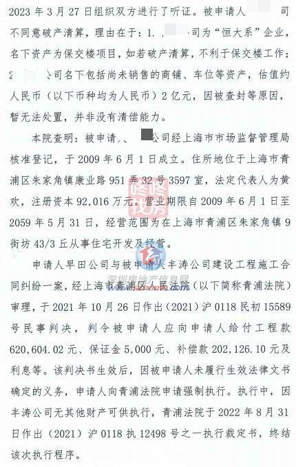 拍卖公告披露,此次拍卖的债权是“恒大系”公司上海丰涛置业有限公司(简称“上海丰涛”)拖欠上海早田信息科技发展有限公司(简称“上海早田”)的工程款、保证金、补偿款及利息等。