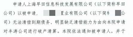 此前申请人上海早田以上海丰涛无法清偿到期债务、明显缺乏清偿能力为由,向上海市第三中级人民法院提出了对上海丰涛进行破产清算的申请。