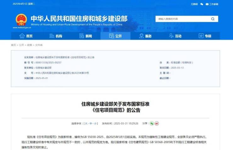 3月31日,住房城乡建设部发布了国家标准《住宅项目规范》(以下简称《新规范》)。