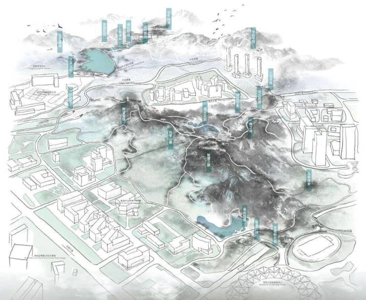 场地凭借一轴三带多链接的构架,链接周边资源,连通海绵系统,建立层次丰富的生态区,串联众多观景台与特色节点,铺陈出全域智慧网络。