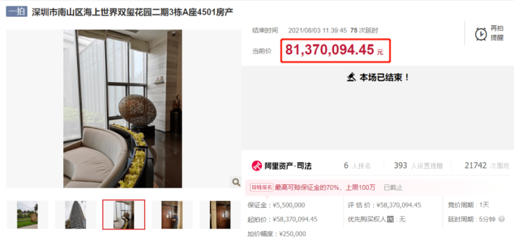 据悉,今年8月,海上世界双玺一套建面约336平的大平层,拍出了8千万+的成交价,单价约24万/平。