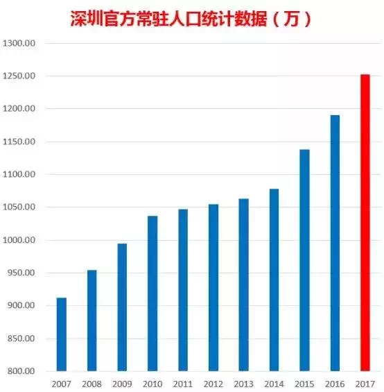 而深圳常驻人口为1252.83万人,比2016年年底的1190.84万人,激增近了62万人。