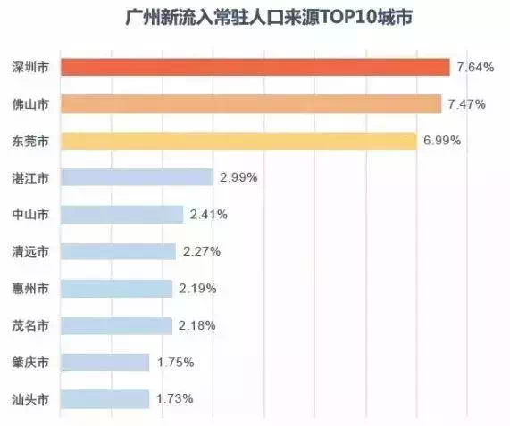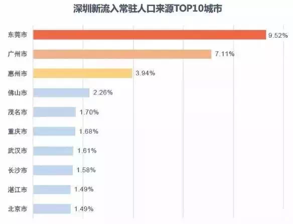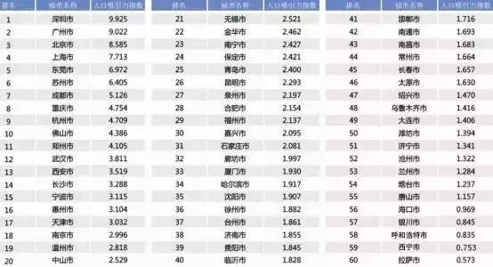 放眼全国,在2017年度城市人口吸引力指数排行榜中,前十位的排名依次是深圳、广州、北京、上海、东莞、苏州、成都、重庆、杭州、佛山。