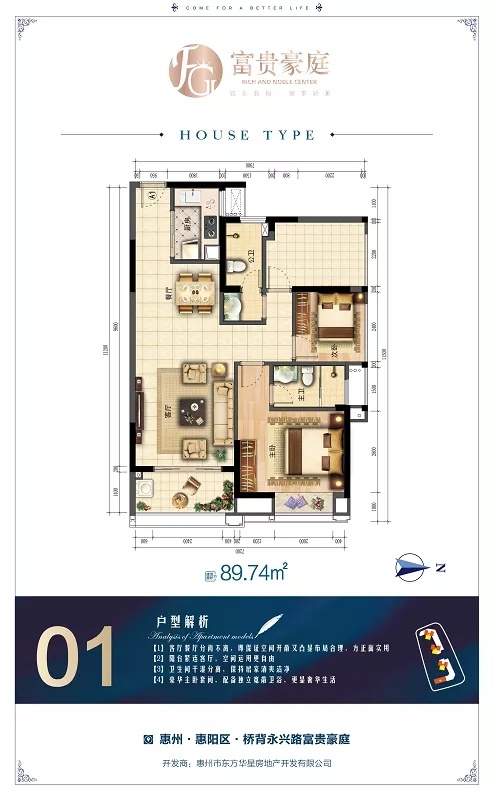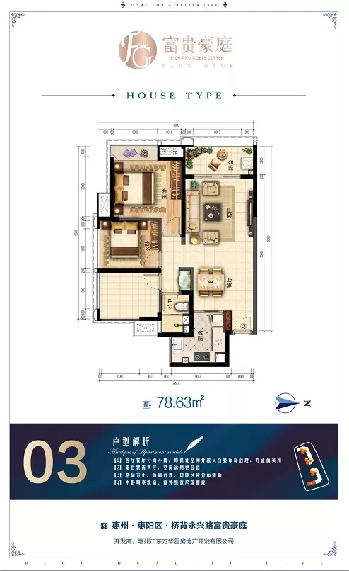 项目所处为惠阳中心区,是目前惠阳居住氛围最为成熟的区域,可归结为双C中心,即CBD中央商务区与CLD中央生活区的优质组合。项目总占地15443㎡,总建面83403㎡,由3栋高层、1栋写字楼组成。