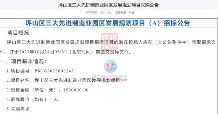 近日,深圳市坪山区工业和信息化局正式启动坪山区三大先进制造业园区发展规划项目(A)招标公告,招标金额150万元。