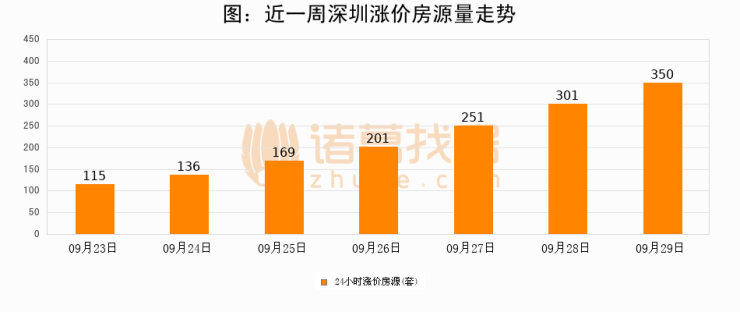 根据诸葛找房数据显示,深圳24小时涨价房源量为350套,较09月28日增加49套,环比上涨16.3%。与此同时,涨价房源占比小幅扩大,业主信心有所提升。