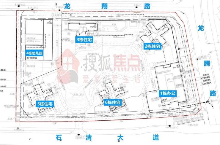 项目由5栋高层及1栋幼儿园组成,呈围合式布局。住宅层高为41-42层,办公层高26层,12班幼儿园层高4层。