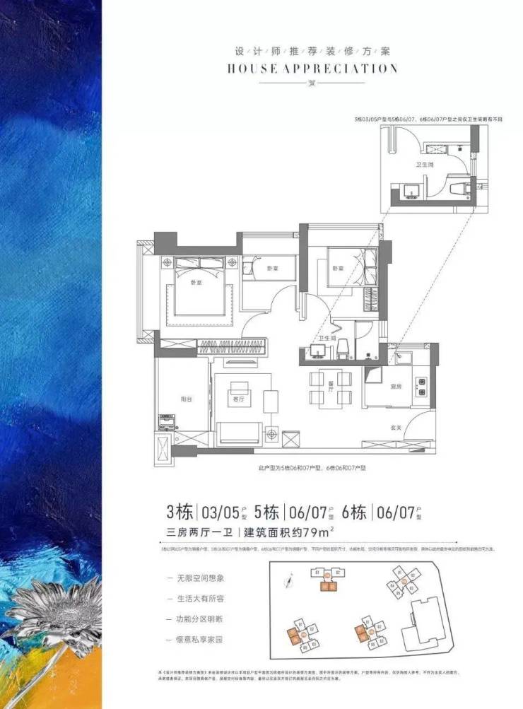 小户型方面,79㎡做到了3房2厅1卫格局,主要生活空间为东南或西南朝向,户型方正,干湿动静分离;