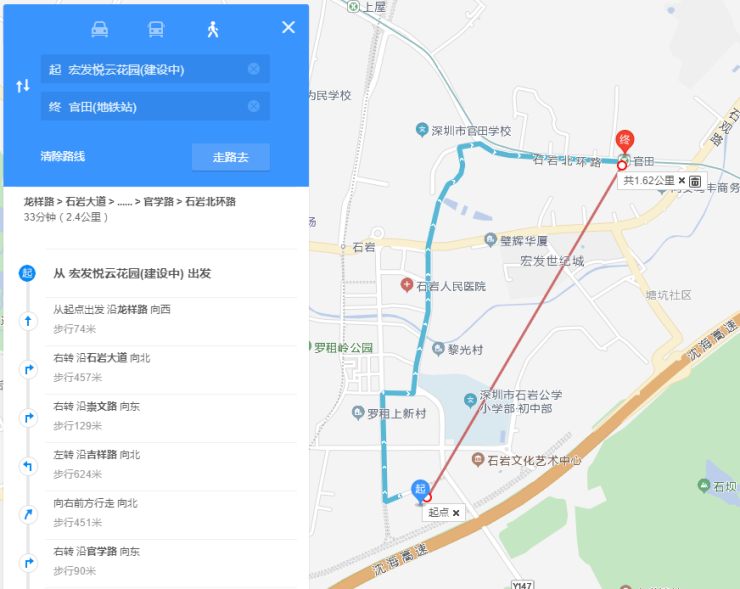 另外,项目东北侧有地铁6号线官田站,但该站点距离相对较远,根据地图测距,直线距离约1.6公里,步行距离约2.4公里左右。