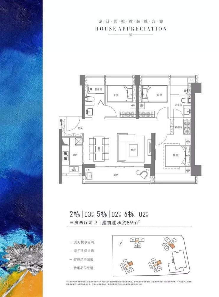 89㎡为3房2厅2卫格局,共有3种户型设计(1个竖厅,2个横厅),其中2栋03户型、5/6栋02户型最为方正。