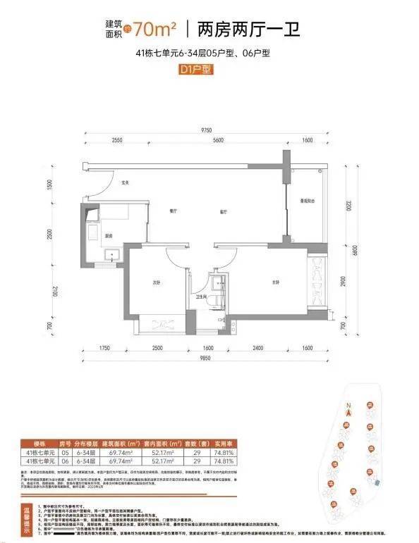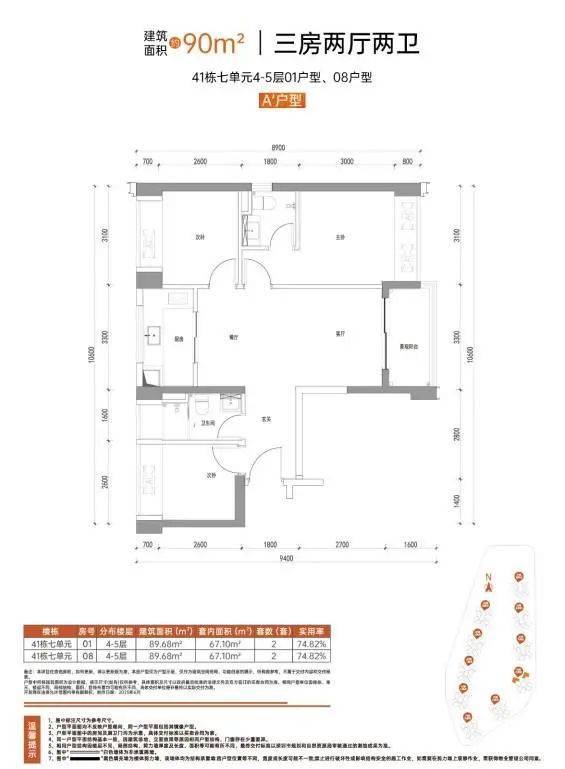 本次配售的整体房源得房率大概74.8%,中规中矩。户型建面为70㎡两房和90㎡三房。