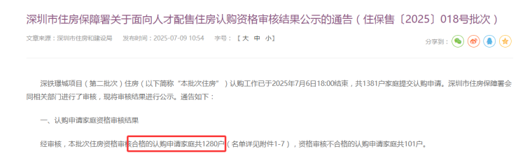 7月9日,深圳住建局公示深铁璟城(第二批次)人才房认购审核名单,本批共1381户家庭提交申请,经查,1280户家庭合格入围。