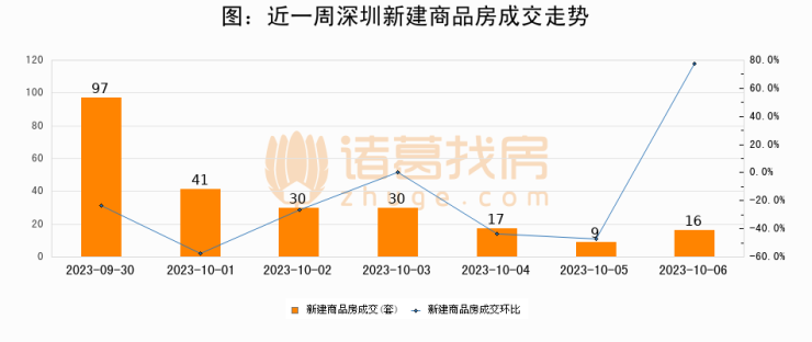 根据深圳市住房和城乡建设局数据显示,2023年10月06日深圳新建商品房成交16套,较昨日增加7套,环比上涨77.8%
