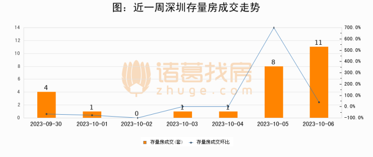 从存量房来看,2023年10月06日深圳存量房单日成交11套,比昨日增加3套,环比上涨37.5%。从近一周存量房成交来看,深圳存量房日均成交套数为3套,10月06日单日成交11套,高于近一周平均水平266.7%。