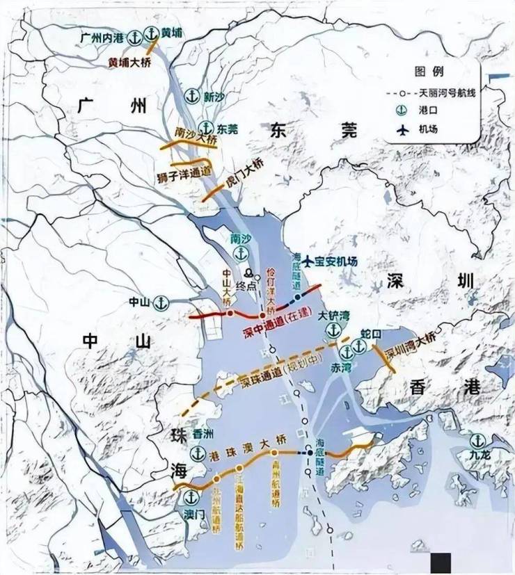 其中开通的有黄埔大桥、南沙大桥、虎门大桥、深中通道、港珠澳大桥、莲花山通道、海鸥通道、深珠通道(伶仃洋通道)则还在规划中。