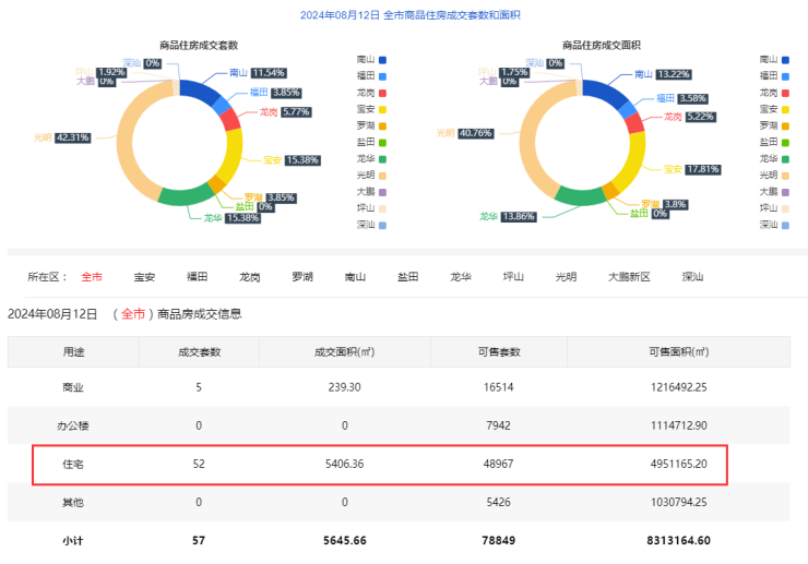 2024年8月12日新房住宅共网签52套。宝安8套;福田2套;龙岗3套;罗湖2套;南山6套;盐田0套;龙华8套;坪山1套;光明22套;大鹏0套;深汕0套。2024年8月12日二手房住宅网签164套。宝安28套…