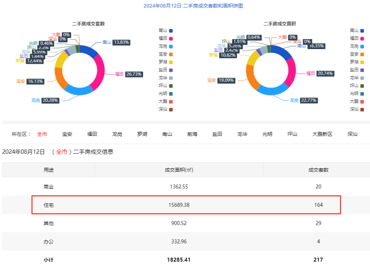 2024年8月12日二手房住宅网签164套。宝安28套;福田29套;龙岗43套;罗湖22套;南山29套;盐田4套;龙华5套;光明0套;坪山4套;大鹏0套。