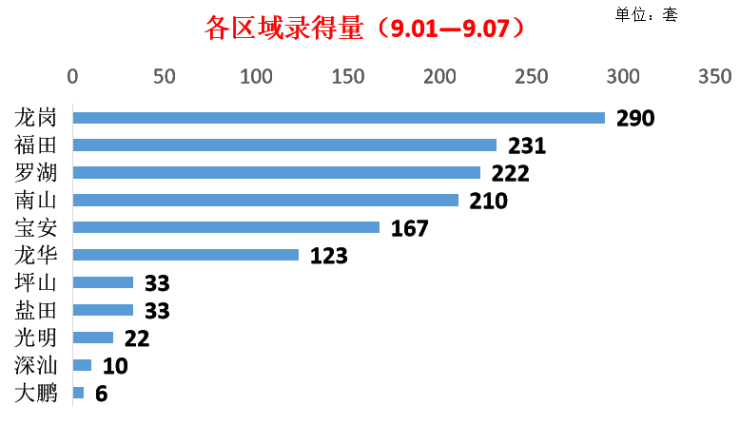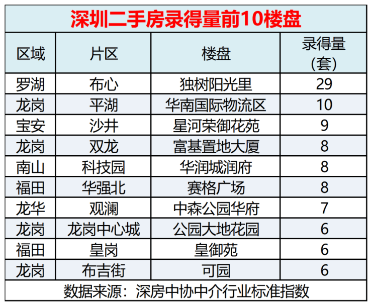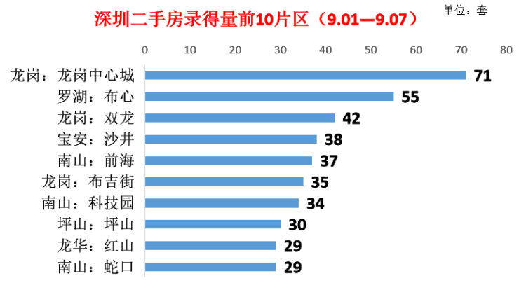 龙岗区本周二手房录得290套,居全市第一位。福田区虽以231套居全市第二位,但从前10片区看,未有片区上榜。具体如下:
