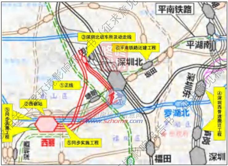 赣深高铁西丽~光明城段正线、西丽站、深圳北动车所及动走线、深圳西站普速搬迁工程、同步实施工程、平南铁路还建工程6个部分。
