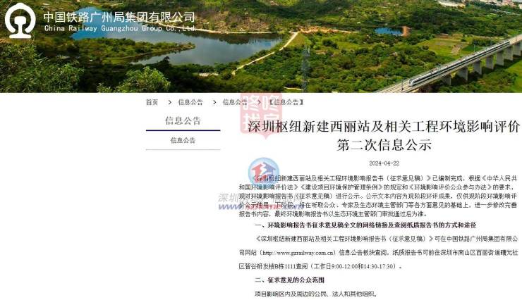 2024年4月,中国铁路广州局集团有限公司官网发布深圳枢纽新建西丽站及相关工程环境影响评价第二次信息公示。