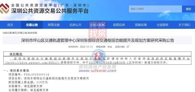 12月13日,深圳公共资源交易公共服务平台发布《深圳市坪山区交通轨道管理中心深圳东部综合交通枢纽功能提升及规划方案研究采购公告》(以下招标项目简称方案)。