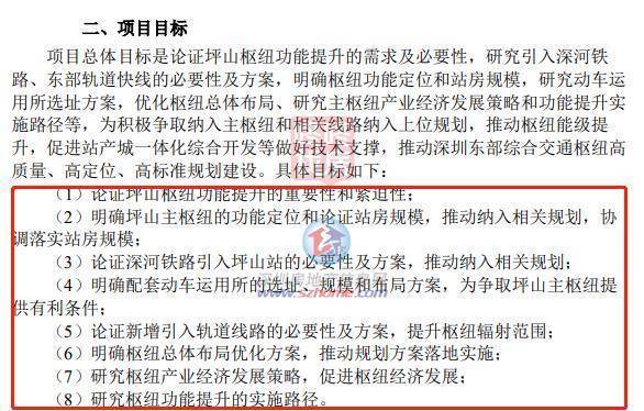 该招标项目将论证坪山枢纽功能提升的需求及必要性,研究引入深河铁路、东部轨道快线的必要性及方案,明确枢纽功能定位和站房规模,研究动车运用所选址方案,优化枢纽总体布局、研究主枢纽产业经济发展策略和功能提升实 施路径等。