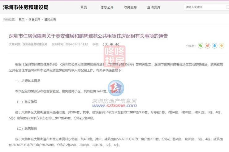1月19日,深圳市住房保障署发布了葵安雅居和鹏隽雅苑公共租赁住房配租有关事项的通告。