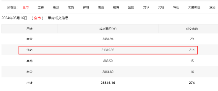 2024年5月16日二手房住宅网签214套。宝安27套;福田41套;龙岗47套;罗湖30套;南山37套;盐田5套;龙华17套;光明4套;坪山6套;大鹏0套。