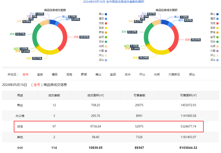2024年5月16日新房住宅共网签97套。宝安23套;福田3套;龙岗 30套;罗湖1套;南山6套;盐田1套;龙华23套;坪山0套;光明9套;大鹏0套;深汕1套。