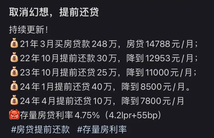 近两年来,各地楼市新政迭出,房贷利率逐渐降低。每刷到一次相关消息,一批高利率存量房贷业主的心就被刺痛。为了尽量挽回损失,他们尽可能节省,攒下一些钱就立刻申请提前还贷。