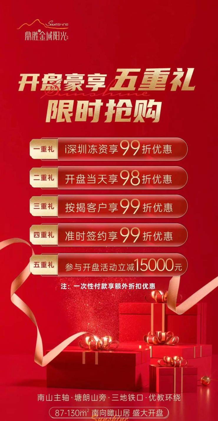 据悉,项目开盘当天可享98折,另有冻资99折、按揭99折、准时签约99折,还有总价减1.5万等多重优惠。