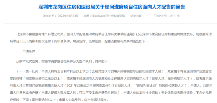 10月24日,龙岗住建局发布星河珑御剩余人才房房源的配售公告。