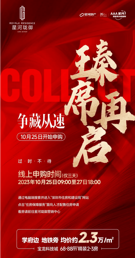 星河珑御本次配售房源共13套,其中,建面约68㎡的两房有4套,建面约88㎡的三房有9套,配售均价约2.3万/㎡,线上申购时间为10月25日-10月27日共三天。