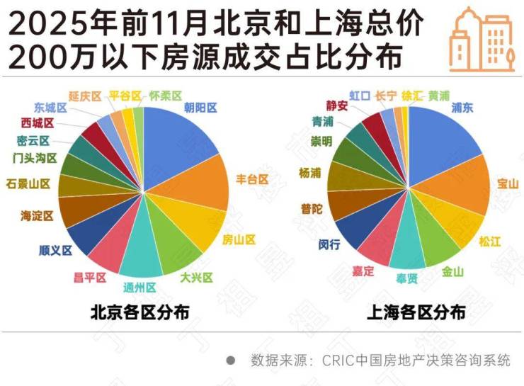 CRIC数据显示,2025年前11月,北京总价200万以下房源共成交约79364套,占北京全市成交的50.44%,2025年前11月,上海总价200万以下房源共成交约86494套,占上海全市成交的41.84%。