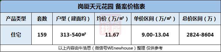 住宅建面约313-540㎡,预售备案均价约11.67万/㎡。预售单价区间约为9.00-13.04万/㎡;总价区间约为2824-8604万元。