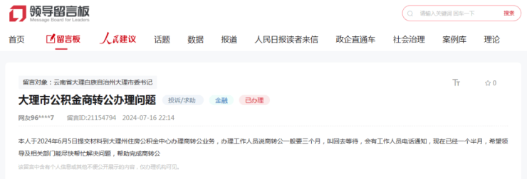 此外,近日有网民通过人民网领导留言板给大理市委书记留言,其于2024年6月5日提交材料到大理州住房公积金中心办理商转公业务,办理工作人员称商转公一般要三个月,现在已经一个半月,希望领导及相关部门能尽快帮忙解决问题,帮助完成商转公。