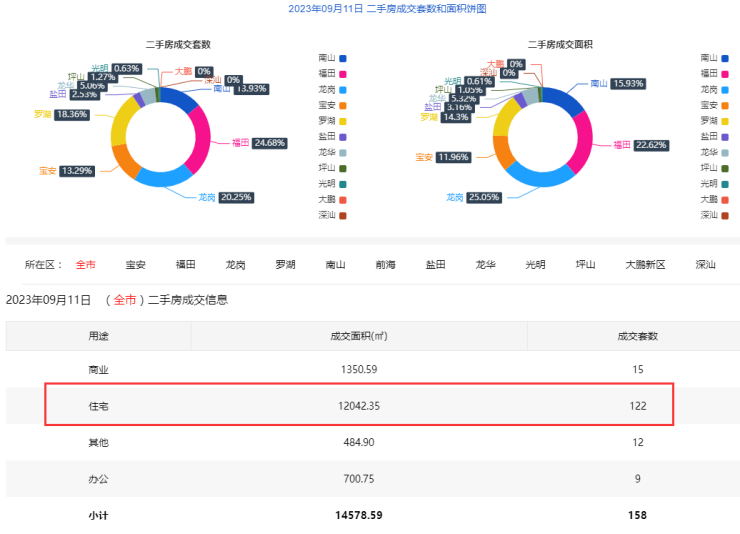 9月11日二手房住宅网签122套。宝安14套;福田27套;龙岗27套;罗湖21套;南山20套;盐田3套;龙华7套;光明1套;坪山2套;大鹏0套。