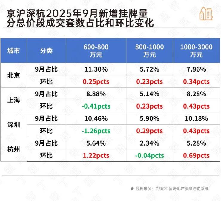 9月份北京、上海和深圳总价800-3000万高端改善房源挂牌量逆势走高:环比分别增长0.57个百分点、0.66个百分点和0.72个百分点。