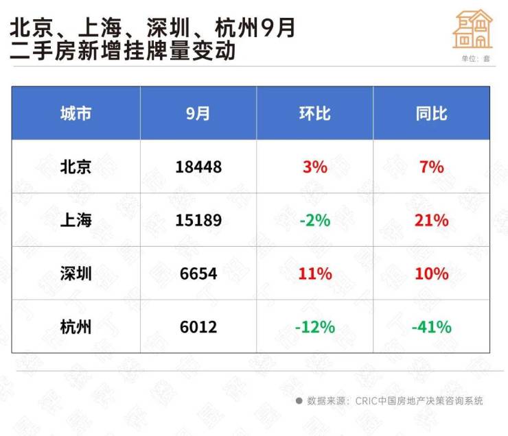 根据CRIC数据,9月北京、上海、深圳和杭州4城共有4.6万套二手房新增挂牌,挂牌量与8月基本持平。