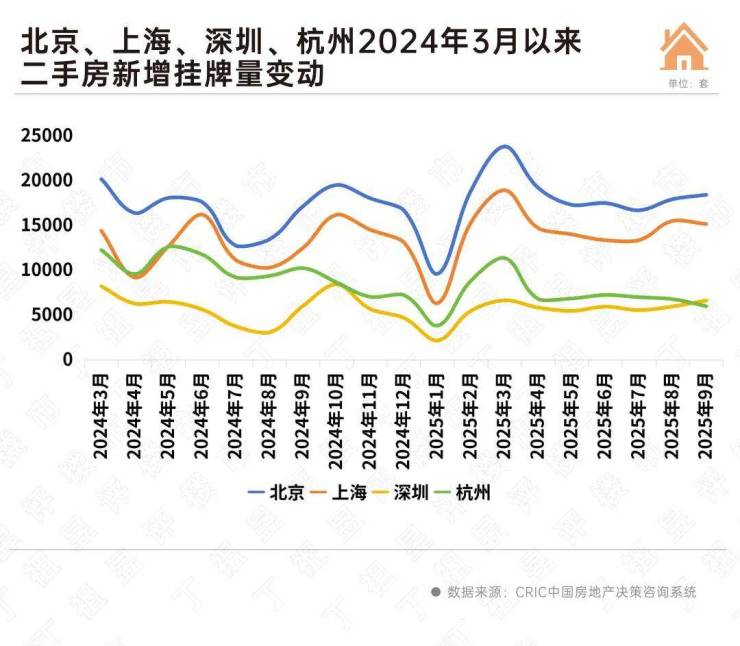 CRIC数据显示,2025年9月,30个重点城市二手房成交环比微降1%,同比虽增9%,但增长动能已明显放缓。