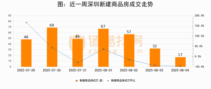 根据深圳市住房和城乡建设局数据显示,2025年08月04日深圳新建商品房成交17套,较昨日减少15套,环比下降46.9%
