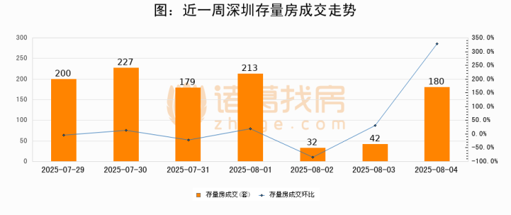 从存量房来看,2025年08月04日深圳存量房单日成交180套,比昨日增加138套,环比上涨328.6%。从近一周存量房成交来看,深圳存量房日均成交套数为153套,08月04日单日成交180套,高于近一周平均水平17.6%。