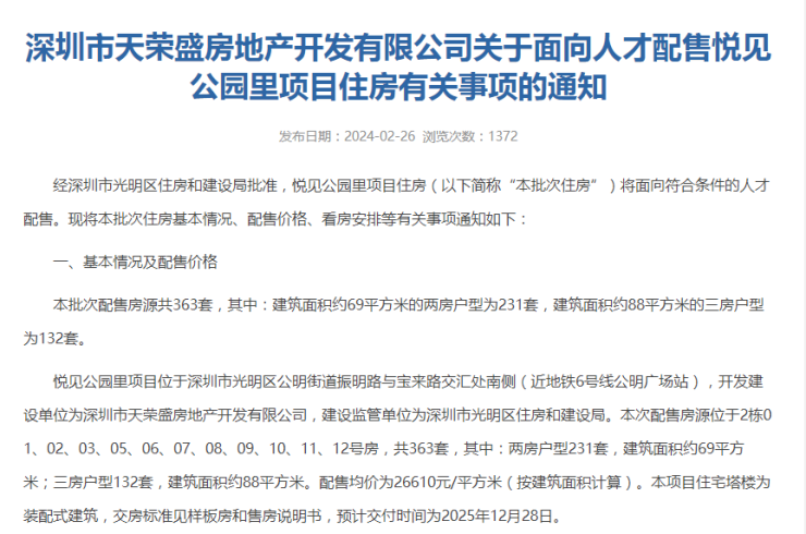 2月26日,光明住建局发布悦见公园里人才房项目配售公告, 本批次配售房源共363套,其中:建筑面积约69平方米的两房户型为231套,建筑面积约88平方米的三房户型为132套,配售均价为26610元/平方米。本批房源线上申请认购时间为:2024年2月27日9:00至2024年3月7日18:00。