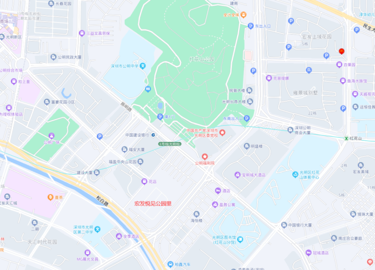 市政配套:周边市政配套已经发展的成熟,在宏发悦见公园里直线距离约500米范围内拥有光明区图书馆(红花山分馆)、红花山体育公园、红花山公园、公明广场等市政配套,业主学习、运动、休闲娱乐均在家门口可享。
