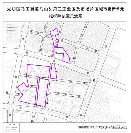马山头第三工业区及市场片区城市更新单元位于光明区马田街道,北临松柏路,南靠通兴路,东临富利南路。拟拆除范围用地面积72588㎡,拟更新方向为普通工业、居住功能。