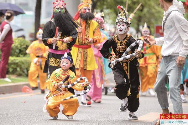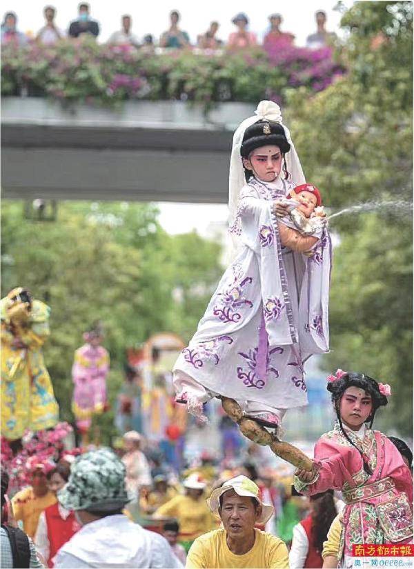 飘色表演队伍过来啦!人群中爆发一阵欢呼。飘色巡游是一种融戏剧、魔术、杂技、音乐、舞蹈于一体的传统民俗艺术,参演的孩子年龄为5岁至7岁,飘色巡游队伍里的萌娃们一出场便成了大家目光的焦点,他们以钢枝凌空而立、高高“飘”在空中,造型各异,有“荷花仙子”“送子观音”“步步高”等,引得游人啧啧称叹的同时也觉得逗趣不已。在巡游中,他们除了扮演神仙,还“即兴表演”了打瞌睡、吃棒棒糖,以及被迫营业时的各种表情包。他们经过的地方,大家纷纷拿出手机,开启疯狂拍照模式,人们内心的喜爱之情溢于言表。