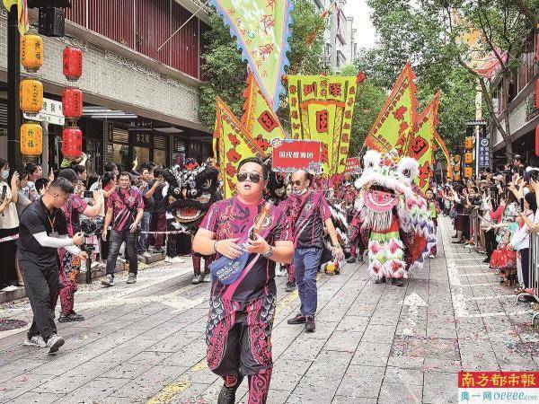 当天的北帝古庙广场流光溢彩,各路“高手”共同演绎了一场非遗文化的“华山论剑”。舞龙舞狮、舞麒麟、英歌舞、飘色等凸显浓郁岭南文化特色的队伍,不时穿街过巷表演,精彩应接不暇。只见一群大小狮子踩着鼓点,时而灵狮探险,时而雄狮抖威,时而金狮倒挂,技惊四座;身形矫健的年轻后生,随着鼓点的起伏,手举麒麟,伏、卧、腾、跃、跳,上下翻飞,威风凛凛,栩栩如生,他们不断变换着姿势。出洞、挠头、耍尾、舔足、醉青……引得围观游客一片叫好声。