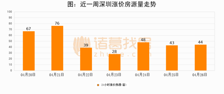 根据诸葛找房数据显示,深圳24小时涨价房源量为44套,较04月25日增加1套,环比上涨2.3%。与此同时,涨价房源占比小幅扩大,业主信心有所提升。
